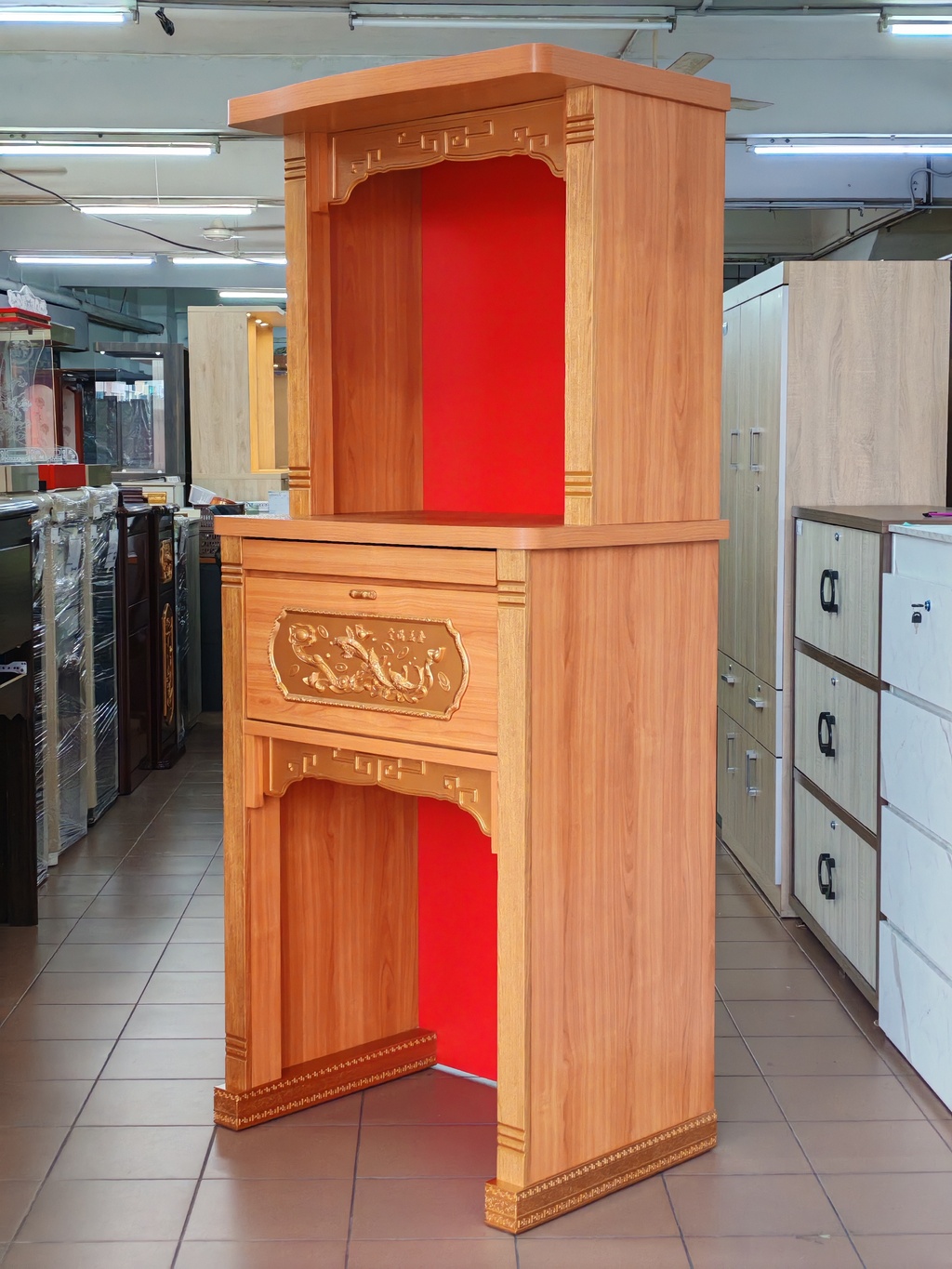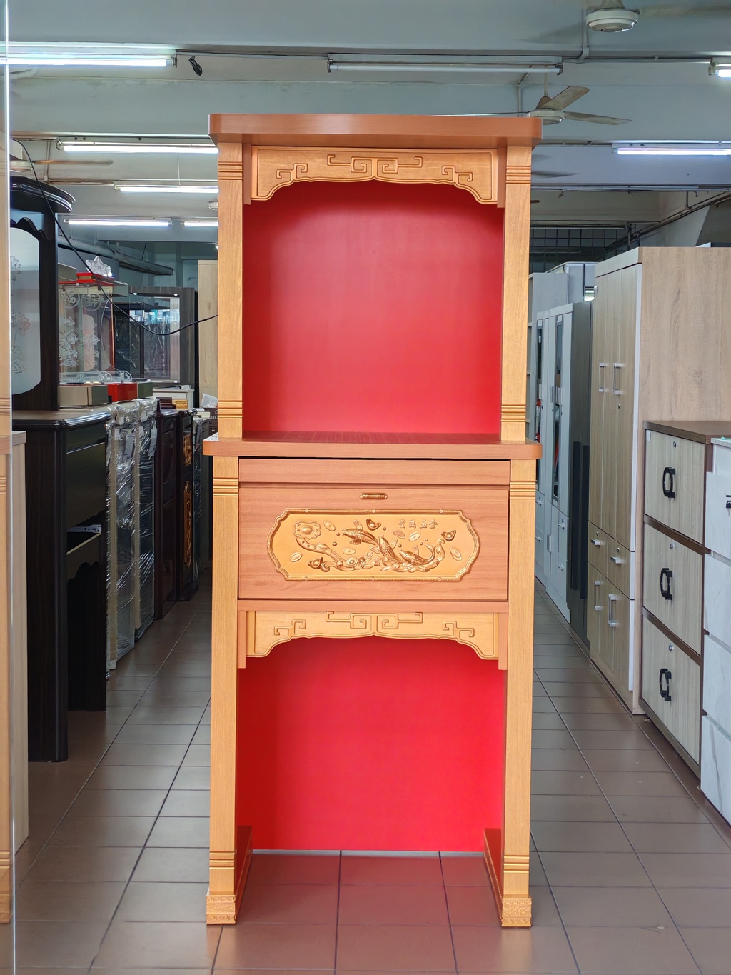 这款精美的传统祭祀供桌采用优质木材精心制作,完美结合了实用性与东方美学。供桌采用经典设计,包含两个红色背景的供奉区域,中间配有一个精致的抽屉,抽屉正面饰有精美的鱼类和植物图案雕刻,象征着富贵与吉祥。