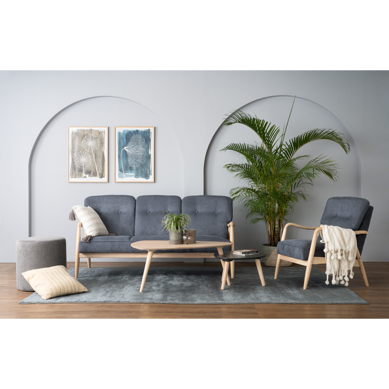 Transform your Malaysian living room into a haven of tranquility and style with the exquisite Figaro 3-seater sofa. Its beautifully crafted White Wash coloured Malaysian Oak frame forms a distinctive, rounded silhouette, providing a fresh, airy foundation that perfectly complements the serene Dim Blue Moleen fabric upholstery. The generously sized, plush cushions, with the inviting texture of the Moleen fabric, promise a luxurious lounging experience for family and guests.