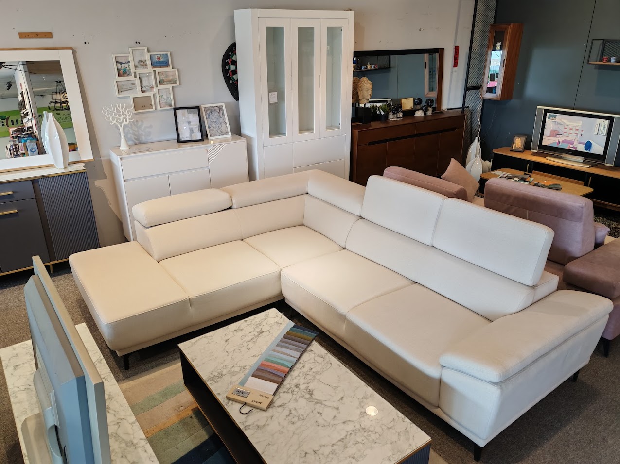 A chic and comfortable L-shaped sectional sofa in a versatile cream-white fabric. Features clean lines, plush cushions, and a contemporary design perfect for modern living rooms.